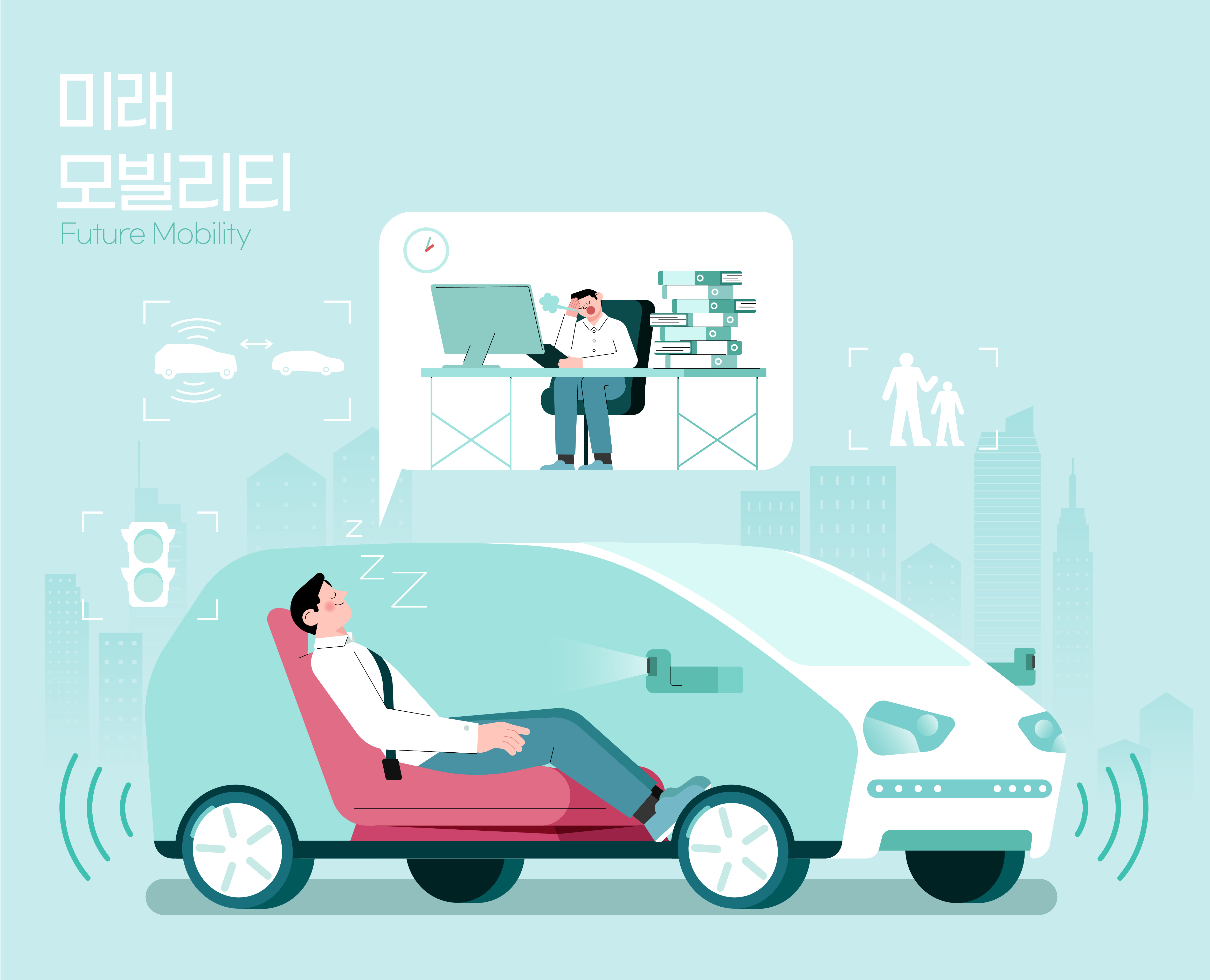 저는 상상만으로 이미 행복합니다. 내 차가 내 목소리를 인지해 시동을 걸고 목적지를 말하면 이를 감지해서 최적의 경로로 직접 운전하지 않고 출근할 수 있는 시대, 제가 가장 꿈꾸는 세계입니다. 여기에 들어간 이 모든 기술, 모빌리티입니다.